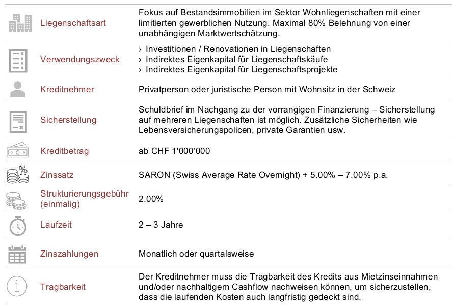 Das Finanzierungsangebot richtet sich an Kreditnehmer, die in Bestands-immobilien investiert sind, insbesondere in Wohnliegenschaften mit einer limitierten gewerblichen Nutzung.